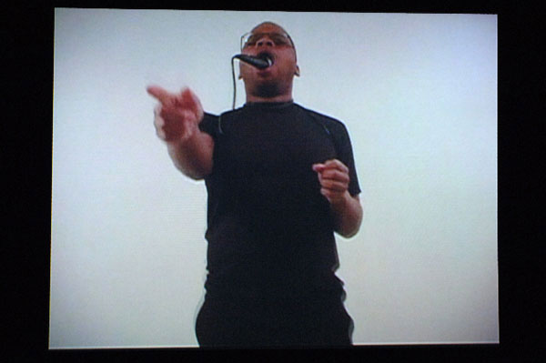 McKenzie, a 2000 grad of University of the Arts, works primarily in performance and video. One of the works in the exhibition, Babel (2006), documents a performance in which, microphone in mouth (literally in his mouth), McKenzie addresses the audience with incomprehensible speech, making signs with his free hand. He is insistent, repetitive, and clearly trying to communicate. It surely made his audience uncomfortable, even before he fell to the ground, got to his feet again, put the microphone back in his mouth and returned to the muffled speech. The location was not clear, but the audience was entirely white, and the sense I made of the work is that communication across racial lines is distorted, if even possible, with frustration on one side and discomfort on the other.