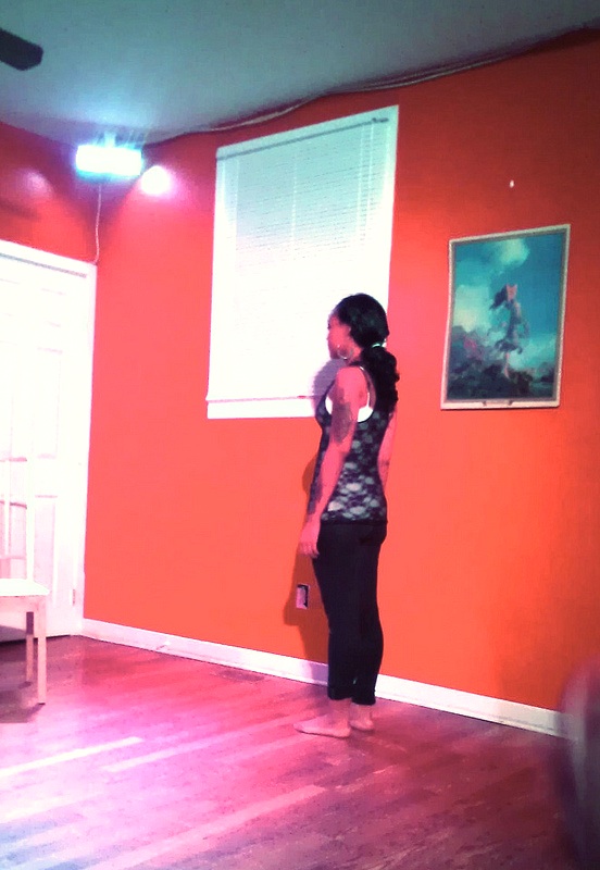 I was one of about 14 people who came to this performance. To say this was an extraordinary experience for me is a vast understatement, sitting in someone’s dining room/kitchen emptied of furniture, sitting just a foot or two away from the performing family. The family–Adam, Princess and Lea Bostick–each told us stories about themselves, stories that gave us a sense of their values and concerns, stories that revealed beliefs, heartbreaks and vulnerabilities not normally shared with a group of strangers. I learned about the life and death struggle of Princess’ baby and her own struggle to find the strength to endure the realities she was facing. I learned that the strapping Adam could walk away from success to return to the family who loved him best, and I learned how Lea embraced Buddhism for relatively superficial reasons but instead found in it a way to strengthen herself and improve her life.