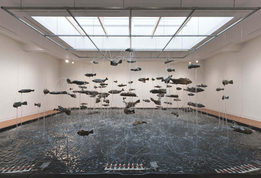 Nauman, who is known for his highly conceptual work and often exposed infrastructures that celebrate the tubes, electricity and mechanics that make the world go round, has created a waterworks that includes a black rubber cachement basin, maybe 6 inches deep, that holds the pipes and water that run through the fish. It’s quite inelegant, but works great.