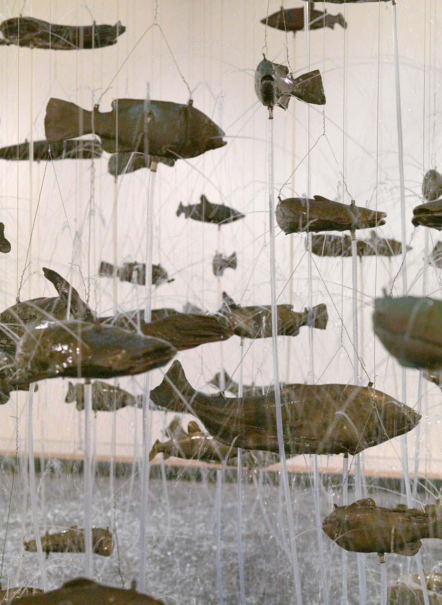 Each of the hundred bronze-cast fish, is suspended above the shallow basin, and spigotted by a clear plastic tube that brings water up and into the fish, from whence it pours out through holes in the mouth, eyes, and gills.