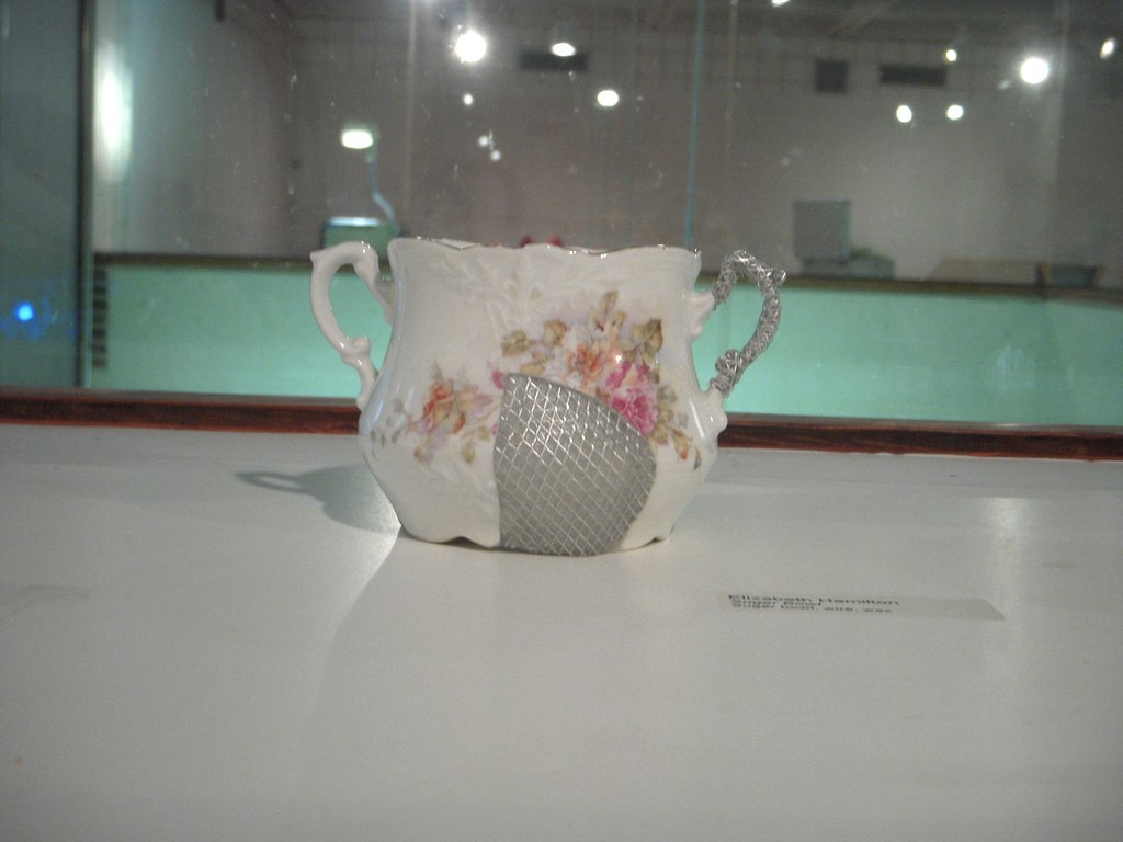 Elizabeth Hamilton’s broken and fixed teacup, creamer and sugar bowl, looking gorgeous with all the obvious repairs, were in last month’s show at Tiger Strikes Asteroid. It’s great to see Brett and Hamilton’s works again, and they travel well, looking proper in this oddly bifurcated academic gallery, with two spaces separated by large glass windows, a chasm in between and a narrow connecting corridor.