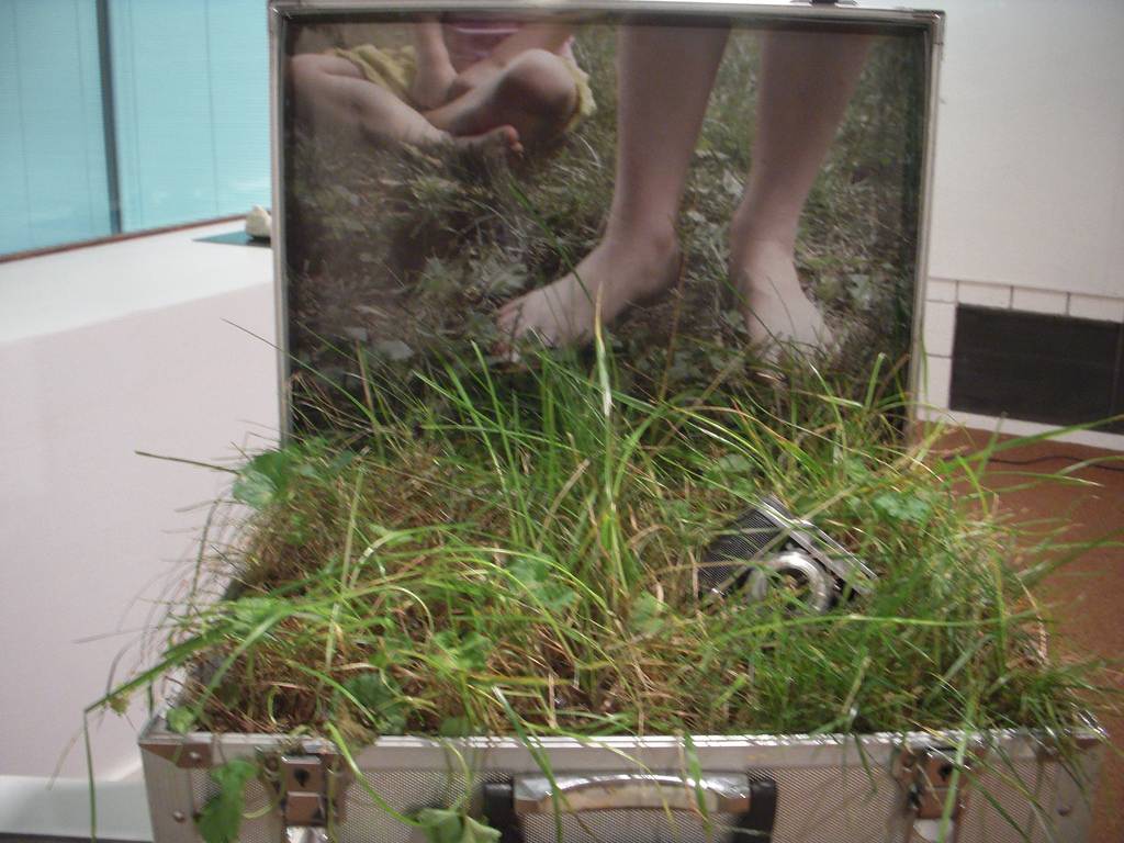 Robin Brewer’s You Can’t Take It With You, also nods — to Duchamp. The suitcase filled with grass, some found objects and a photo has a dreamy quality that is both seductive and a little morbid. Duchamp’s Boite en Valise — a little box with the world in it, as well as his Etant Donne, the peephole wonder at the PMA — are both references. Brewer even provides view finders for you to espy the details of her piece… They make great peep holes into the world created here.