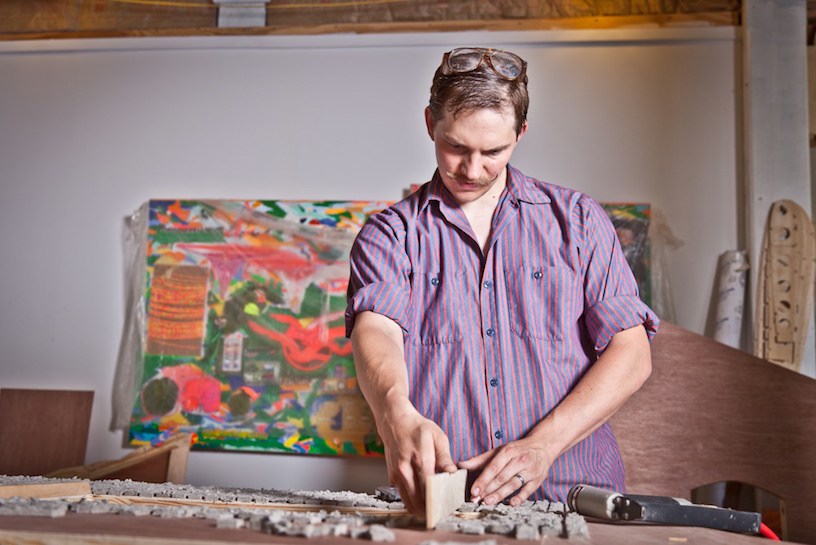 Lewis Colburn, a newbie to Philadelphia, moved here with his wife in May, 2009, after both got MFA degrees from Syracuse University. “We didn’t have jobs lined up post grad, and we had friends here,” he said. In Frankford, they bought a house and also rent a large 1830 square ft. (20×30 ft.) studio with 12 ft. ceilings in the Viking Mills building a block away from their home.
