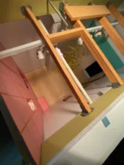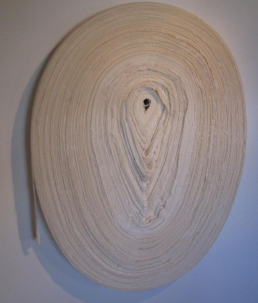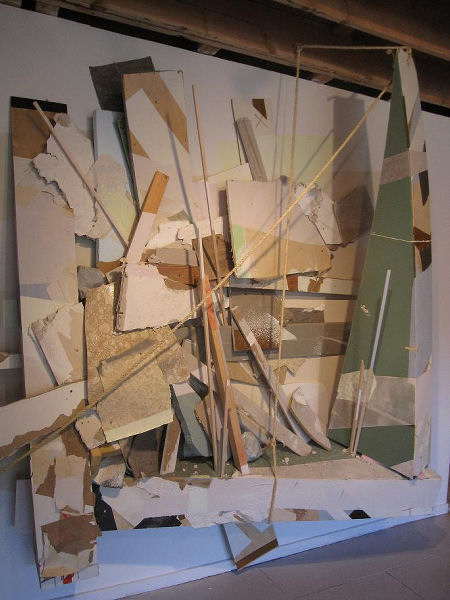 Katie Bell’s installation “The Maiden” is a room interior ripped apart and deconstructed, then glued back together on the wall like a digested, regurgitated meal. It’s questionable what kind of building exploded in the making of this piece, but pieces of linoleum tile give the feel of a domesticity. Overwhelming and barely bound together, the piece creates its own violent and chaotic order.