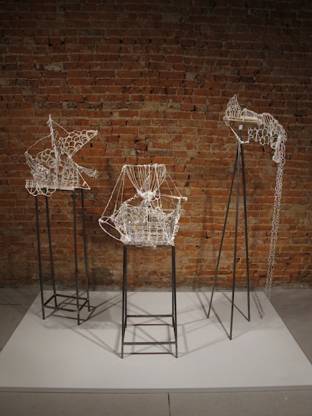 Named after the structures they are placed on, Ester Kislin’s abstract sculptures are skeletal outlines of shapes both organic and inorganic. They reward close engagement from various angles with ambiguous and thought-provoking form.