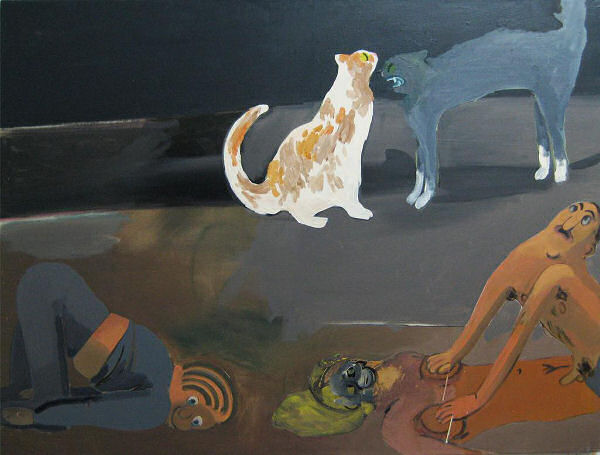 Standing in a zone all its own, Heidi Hahn’s playfully demonic painting in the backroom is cartoony and weird. It also has a unique combination of the array of elements common through most of the paintings she has posted on her website: cats, sexual activity, figures sprawled on the floor, and the strange mask-like face of the lying figure at right. The composition between the legs of the bodies doesn’t indicate how prevalent strong architectural vertical lines and presences are in most of Hahn’s other works, which at times border on a significance akin to that of works by de Chirico. The twisted interplay between the figures and mixed darkness of the receding floor are strange but integral elements of this dreamy work.