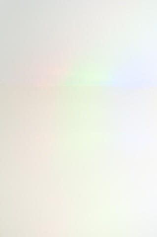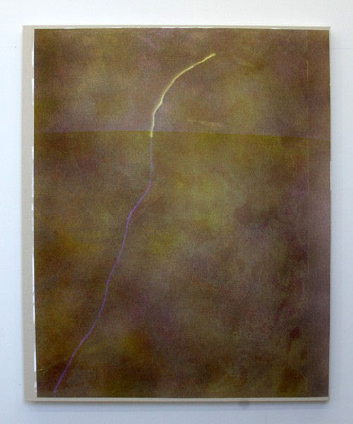 Contrasting nicely with Bell’s chaotic arrangment, “Rainbow” by Amy Maria Harbilas exists at the edge of optical perception, subtle and barely discernible from the white wall it is mounted on. A full range of color is in the digital print, but so muted and oblique as to hover on the edge of non-existence. Seemingly placid, the piece’s faintness actually agitates the eye while pulling it inside, searching for an object. Only on an illuminated computer screen could the greasy, wide strokes of color or the horizon they seem to traverse be seen clearly.