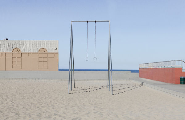 Thought provoking in a more concrete, real-world (or dream world) way, Lauren Marsolier’s photography, with its austerity and strong geometric lines, toes the line between reality and a digitally created alternate world. This photograph exemplifies her current body of work, where washed out, shadowless landscapes with impassive buildings form a reinterpretation — a sterile dreamscape — of what appears to be the artist’s native California.