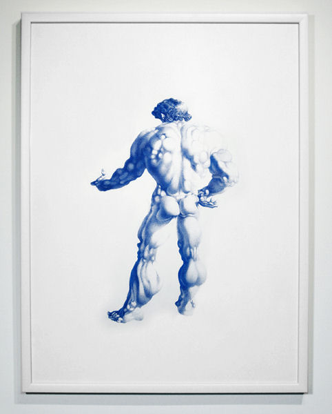 As crisp as Hatton’s painting is murky, Armando Veve’s drawing of an intensely stippled re-imagining of a classical David-like figure is humorous and self-aware of its bizarrely-muscled subject. Like other pieces in the show, the image is created with a light touch, giving it a transitory sensibility.