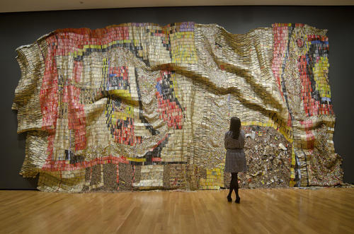 El Anatsui, ‘Earth’s Skin,’ (2008), aluminum and copper wire, approximately 177 x 394 in., photo by Joe Levack