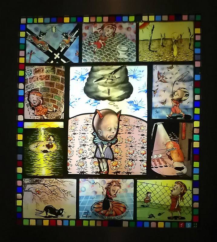 These traditional craft and vernacular materials and domestic references are also part of that democratization. The trend touches not just the African-American artists, but white ones too. Liza Lou shows sequinned panties (oh, well, with a substrate of papier mache, not fabric!) worthy of the cheering squad, and Judith Schaechter has single-handedly rejoined the craft of stained glass with fine-art and cartoon sensibilities.