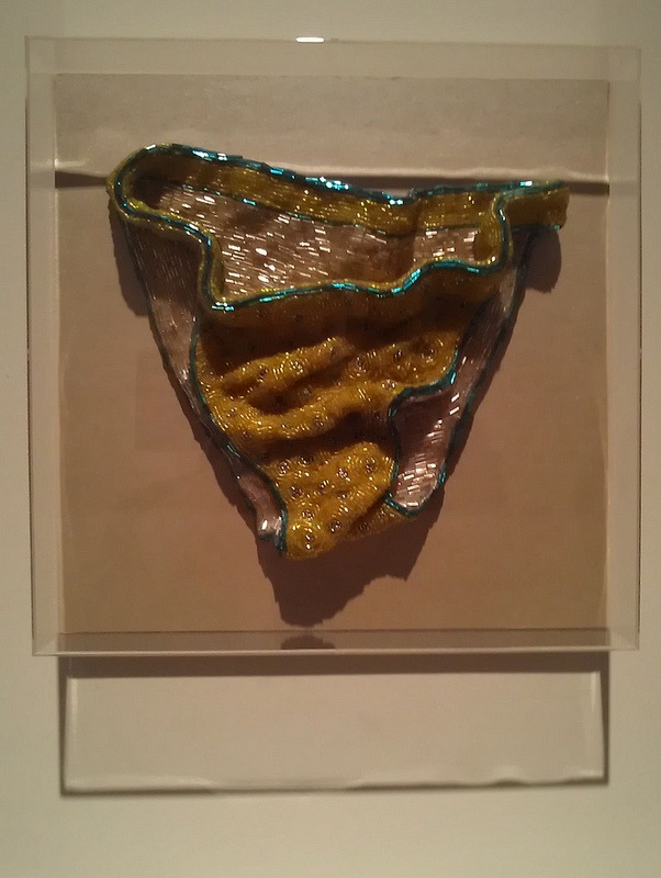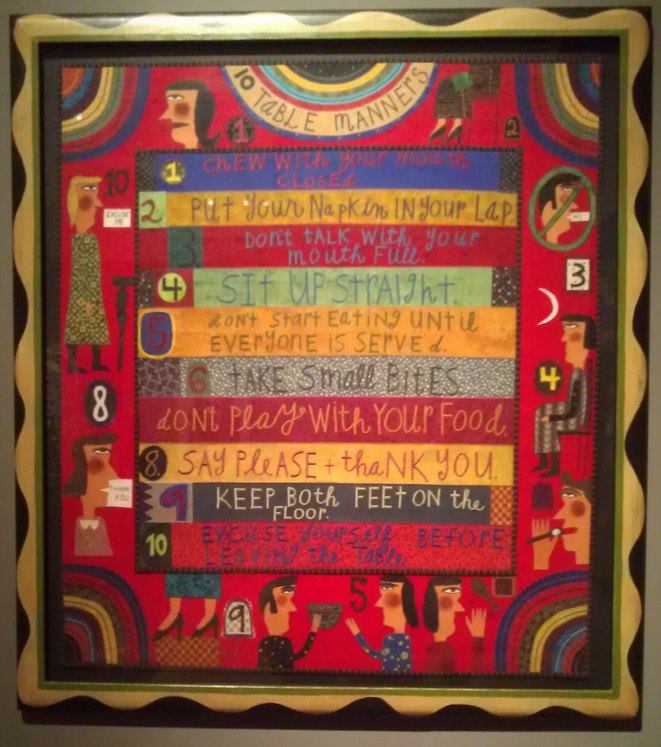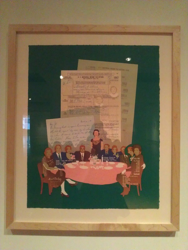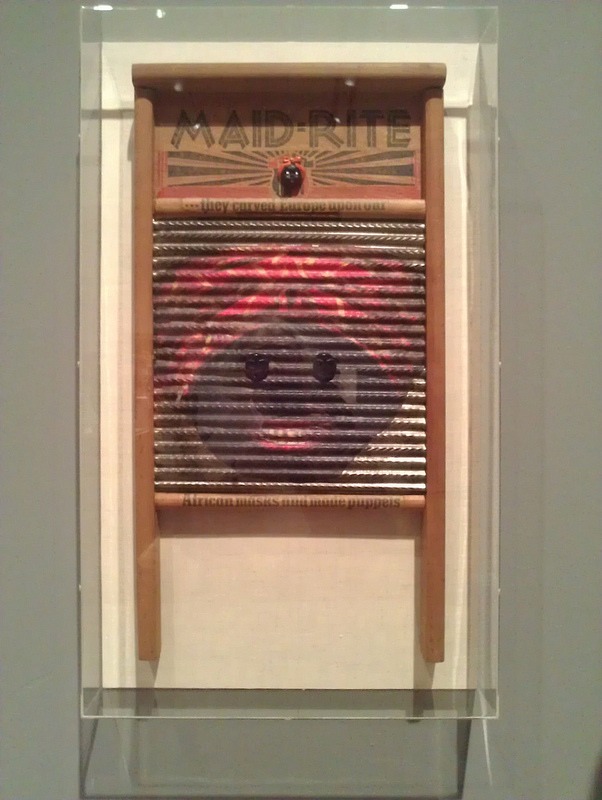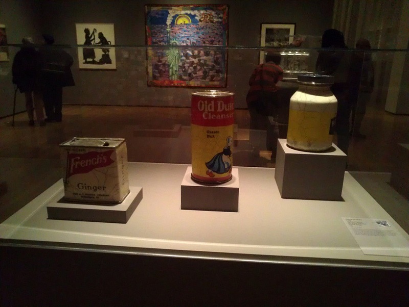 That democratization is represented here not only in who is making the art but in how. There’s a solid African-American presence in the collection as well as a smattering of other non-whites. Kara Walker is represented by her silhouette figures etched into glass cannisters. Yup! Canisters. Faith Ringgold uses needlework for a monumental history painting quilt. Betye Saar’s mixed media portrait of a maid is made with a vintage washboard, using outsider art techniques. (Speaking of democratization, some outsider artists are also in the mix).