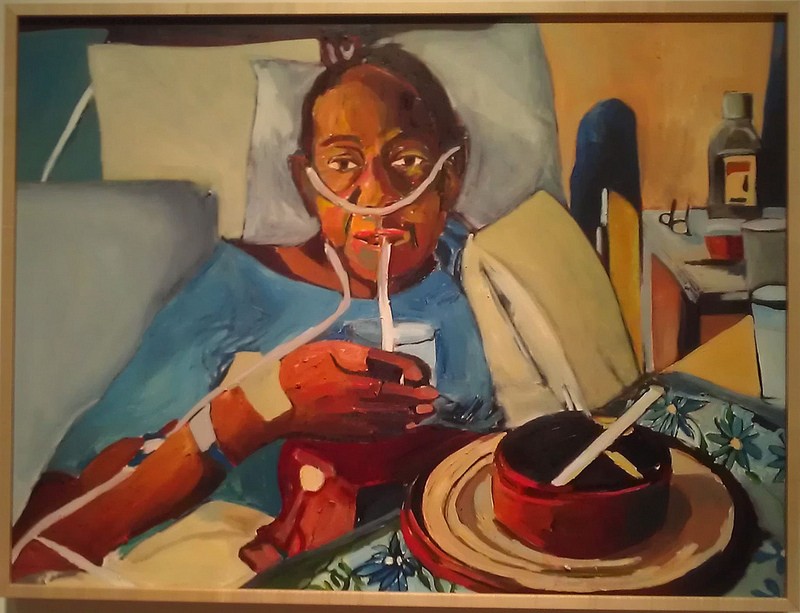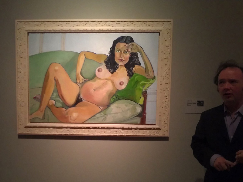 The frank gaze of the subject in Alice Neel’s Portrait of Claudia Bach, Pregnant, belongs to an anti-Olympia, with the delicate reality of delicate blue veins criss-crossing Bach’s breasts and the startling truth of pubic curls. Beverly McIver’s Mom on Oxygen, lays the artist’s heart bare, in a subject that has nothing to do with sex or power or religion.