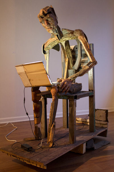 “browser” is composed of found objects and wax and greets the viewer upon entry. A man is perched on a chair and peers into a glowing laptop. Rough wood scraps comprise the subject’s body. Construction of the piece is haphazard, and I noticed that the man is missing feet. In an interesting textural juxtaposition, the subject’s shoulders, face and hands are gracefully formed with wax. The piece had a definitive air of speed suggesting that our virtual interactions are somewhat slapdash. I must admit, I stopped using a certain social networking site a few years back and I’ve noticed a return to formality in my e-mails and wonder whether all that instant communication is beneficial to the way in which we relate.