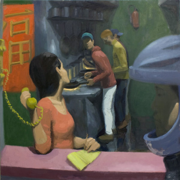 One choice I found interesting was that Fernandes-Halloran does not always fully render the faces of the subjects in these paintings. “chinese takeout” places the viewer in line at a restaurant waiting for a take-away order. The faces of the employees in the kitchen vary in degrees of specificity. “pretty viewer” is a close-up of a woman who appears to be attractive, but her face is blank (as in, there are no features). Here I thought about my own memories of passing conversations and brief interactions with strangers whose faces I only partially recall.