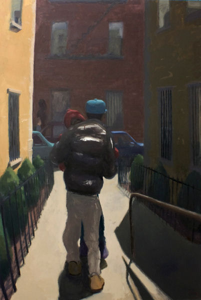 I have a natural curiosity in people and Fernandes-Halloran seems to share this interest. “introducing his baby” is tender; a group of men huddle together on the sidewalk, engaged in conversation around a man holding his newborn child. It seems that this scene was recalled from Fernandes-Halloran’s memory. The body language of these men is deceptive—at first glance I thought they might have been fighting or arguing. Two men have their arms around each other and they appear to be animated. The man who holds the baby is positioned towards the back of the group, the baby’s plump legs are barely in view. It’s always interesting to observe a warm interaction from afar and be reminded of man’s capacity for love and joy.