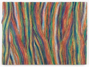 When we dropped by Fleisher-Ollman to see Musson’s outstanding exhibit of fabric paintings we spent a few minutes with John Ollman and gallery director Alex Baker who were in the midst of upcoming moving day heebie jeebies. As in, when we asked John when they were moving he said “Tomorrow.” Figuratively or literally we don’t know, but it seemed the move was THE MOVE and it was coming. Gallerists love to gab, and so do we, and we picked up a lot of detailed information about the new gallery space and about Musson’s wonderful works.