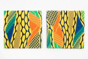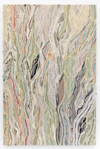 After the gabbing, we slowed down enough to take in Jayson Scott Musson’s work. The large and small Coogi sweater paintings, luscious from afar, are psychedelic wonderlands up close. Their textures, colors, and the sinuous flow of the cloth are both hypnotic and sexy (do we have to say vagina here? the word does come to mind in any number of the paintings, which have the sexy undulations of landscapes and other natural forms). The work wears its art-historical references on its sleeve and on its titles, which salute artists from Sherrie Levine to Gaugin, with AbEx and Pop references thrown in.