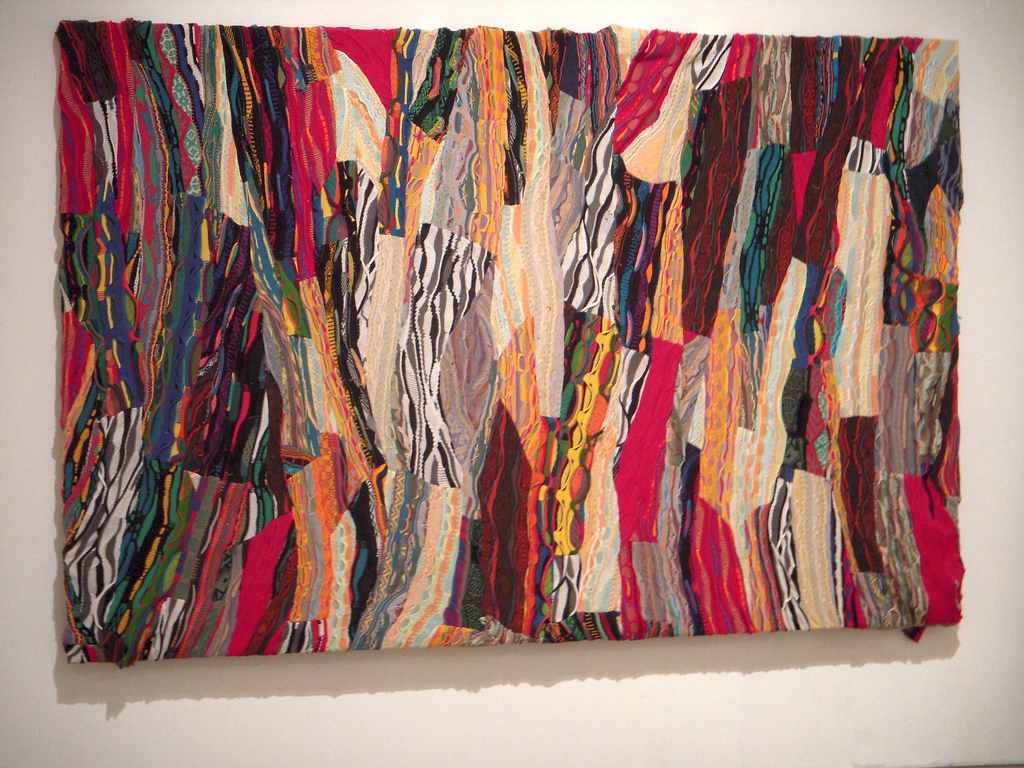 Jayson gets the vintage sweaters online. And apparently at the opening (or at another gathering at the gallery) a collector brought the artist a bagful of sweaters for him to use.  In case you’re wondering, Jayson doesn’t wear the sweaters, ever.