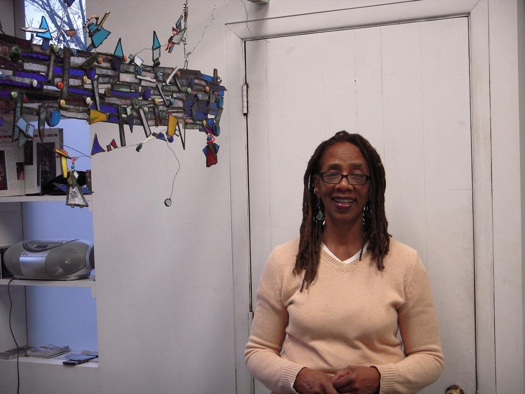 Celestine Wilson Hughes makes large colored glass sculptures that are totemic and sing the praises of the natural world and community. They especially are a celebration of women’s undervalued inner strength, and women’s bodies. Hughes, who has a studio at home in her basement, just started a residency at the 40th St. A.I.R. (Artist in Residence) studios in West Philadelphia. The artist is self taught and her free-standing collages of cut glass, metals, and other objects like beads are wonderful–bright and engaging objects that catch your eye from across a room that you want to explore up close. Next week we will have the full podcast interview. We talked with Celestine on Dec. 9, 2012 at her 40th St. A.I.R. studio.