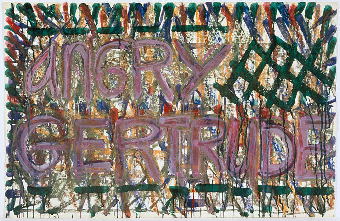 During her talk, Lousie Fishman led us to a section of the gallery in which two of her Angry Paintings hang; she described these works as “seminal” for her. Her first Angry Painting, “Angry Louise,” 1973 was made immediately after being accepted into the Whitney Biennial. Her anger surfaced, she noted, after realizing how long and how hard she had worked to achieve that recognition. She spoke about how personal these painting are to her: “I looked at it and it scared the shit out of me.” The first painting “was terribly upsetting and full of power.” She made many more, each for a specific woman who was important to her, including one for her mother and aunt: Angry Gertrude and Angry Razel. The artist described how she put herself into the body of each woman whose name appears in the paintings, and in the case of Angry Razel, she said, “I started to see the anger that Razel was not able to take on herself.” Razel Kapustin left Russia as a child and she and her family were briefly incarcerated in Hamburg before arriving in Philadelphia. “I didn’t realize what it must have been like for her,” Fishman said.