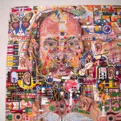 Shawn Thornton’s works come from the experience of a severe debilitating illness, as he previously has told Libby . Thornton’s works are both a depiction of visual hallucinations the artist has experienced and a record of his attempts to regain mental self-control. New and old pieces in the show include further explorations of this subject matter, in the style that he has successfully developed in past years. The artist’s labor-intensive oil paintings structurally resemble brightly-colored circuit-board arrangements and are packed with figures, symbols and characters that convey an obscure narrative.