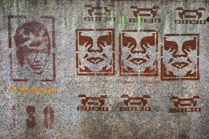 We passed on the blockbuster Picasso show at the Palazzo Reale, partly due to a very long queue, and decided instead to wander the streets, where we encountered some delightful stencils. We’re not sure if Shepard Fairey was responsible for any of them, but André showed his face anyway!