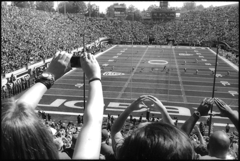A black-and-white shot by Blake Andrews sets you smack in the middle of a football game, tucked into the stands behind enthusiastic fans with their hands raised as if in prayer for a field goal. (Andrews explains, “These folks are making an ‘O’ symbol, which is very common among fans at Oregon Ducks football games,” but it’s not something anyone outside of Eugene, Oregon, would ever recognize—so the signal takes on new meaning.)