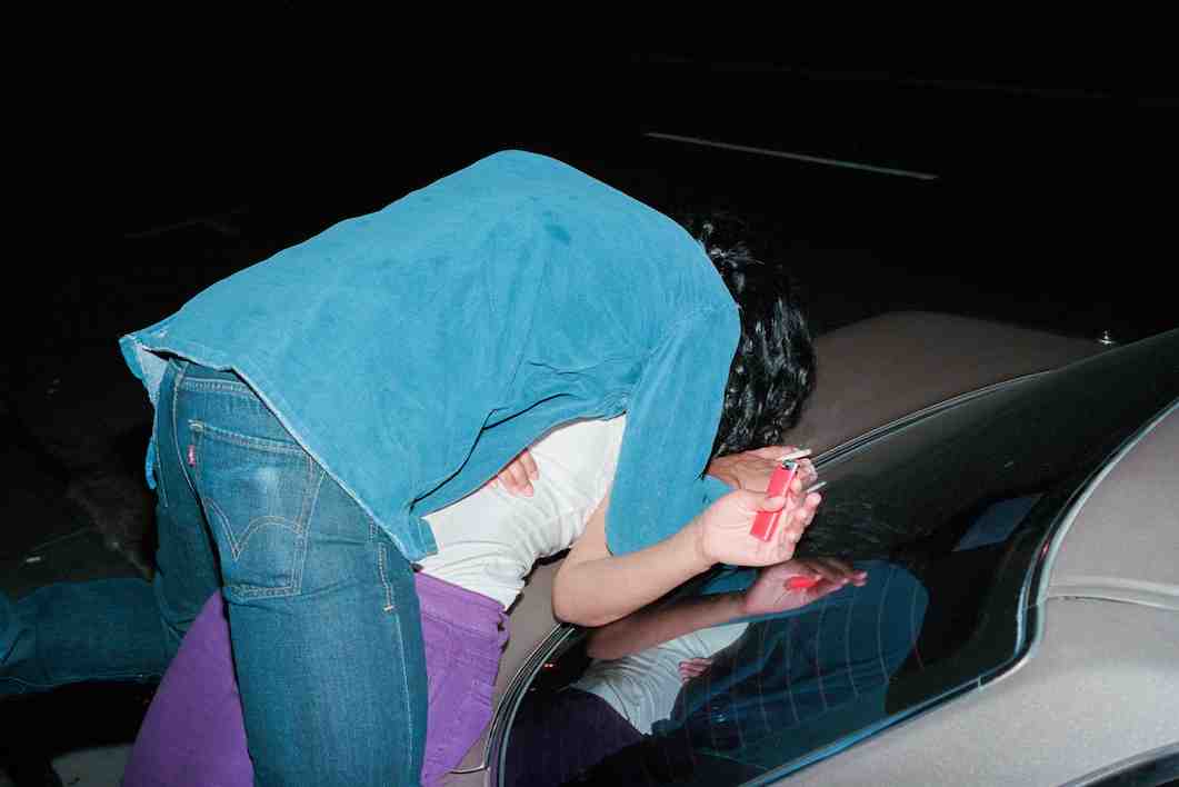 “Things aren’t always what they seem” is a tenet of the most creative and subtle street photographers, and Bryan Formhals’ alarming photograph of a man (is he?) on a woman on a car illustrates this old saw in several ways. The top figure’s posture suggests force, but the couple could be embracing; both faces are hidden by a shock of shiny black hair. He holds a lit cigarette, she the lighter. The photo’s vibrant colors—blue, purple and a dash of red—reflect in the car windshield.