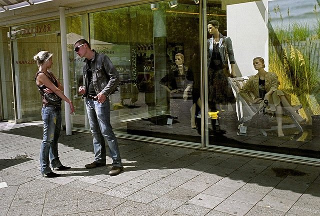 In a photograph taken outside of a Berlin boutique, photographer (and this writer’s father) Chuck Patch captures a conversation between two scruffy-chic smokers. The couple’s body language, all tilt and lean and leather-clad, tells a story by itself—and then you see the audience of stonefaced mannequins observing the pair’s conversation. Is the man menacing his companion or flirting with her? The mannequins want to know just as badly as you do.