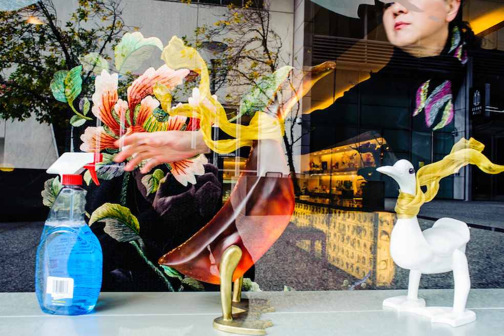 At its simplest, street photography is where the vagaries of time and place coincide. The photographers of “Common Ground” take this happenstance a step further, combining random events with thoughtful composition and precise exposure, all in the space of a moment. Take, for example, Jack Simon’s surreal shot of a window display: two duck sculptures wearing billowing yellow scarves are juxtaposed with a burst of flowers and a vivid blue bottle of Windex, which a gallery employee is hastily reaching in to remove from view. The photo is an explosion of color, made all the better by its human subject’s impromptu inclusion and the fact that the Windex bottle shape evokes a third duck.