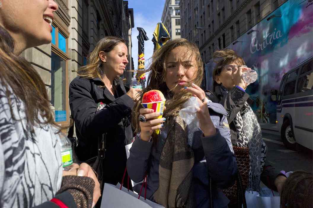 Richard Bram’s photos, lining the back right side of the Photo Alliance, are all color: unusual for Bram, who’s known for his black and white photos. Here, he freezes New York City in the throes of its famous hustle, capturing the distraction and confusion of tourists and the baldfaced resolve of locals. A girl holding a bright, wet snow cone takes center frame in one of Bram’s shots, peering distrustfully at the lens as her windblown companions swig from water bottles. The scene is saturated with sun and color.