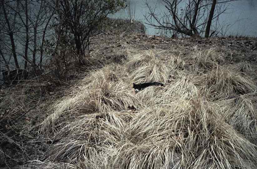 The eyes appear in Big Sur, peering out from behind an enormous tree stump. This image is a study in light, shadow, and texture, and in its sea of dense black, a tiny squirrel holds court. The animal’s gray fur is barely noticeable amidst the gnarled gray of the tree’s bark, captured in rich detail by Panar’s camera and careful printing technique. Detail is abundant in Along the Monongahela River as well. A cat stares out from amidst a thick shag of dried grass and barren branches. In both photographs, the animal is a footnote in the composition —positioned midway between near and far, insignificant in size. Chance is a convincing explanation of its presence, yet it somehow makes the photograph.