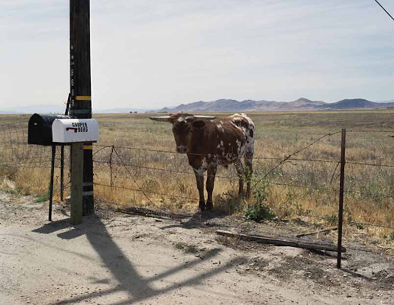 The cow in California Valley looks much more like a character in a regular animal shot. Gazing over a barbed wire fence on a relentlessly hot day, the brown bovine is planted in the precise center, horns and back aligned with the horizon. Though this image is tightly composed, the cow’s intense stare puts it in the same vein as the others. Her stance and coincidental positioning next to the mailbox reminds us that this is her home, and we are passers-by.
