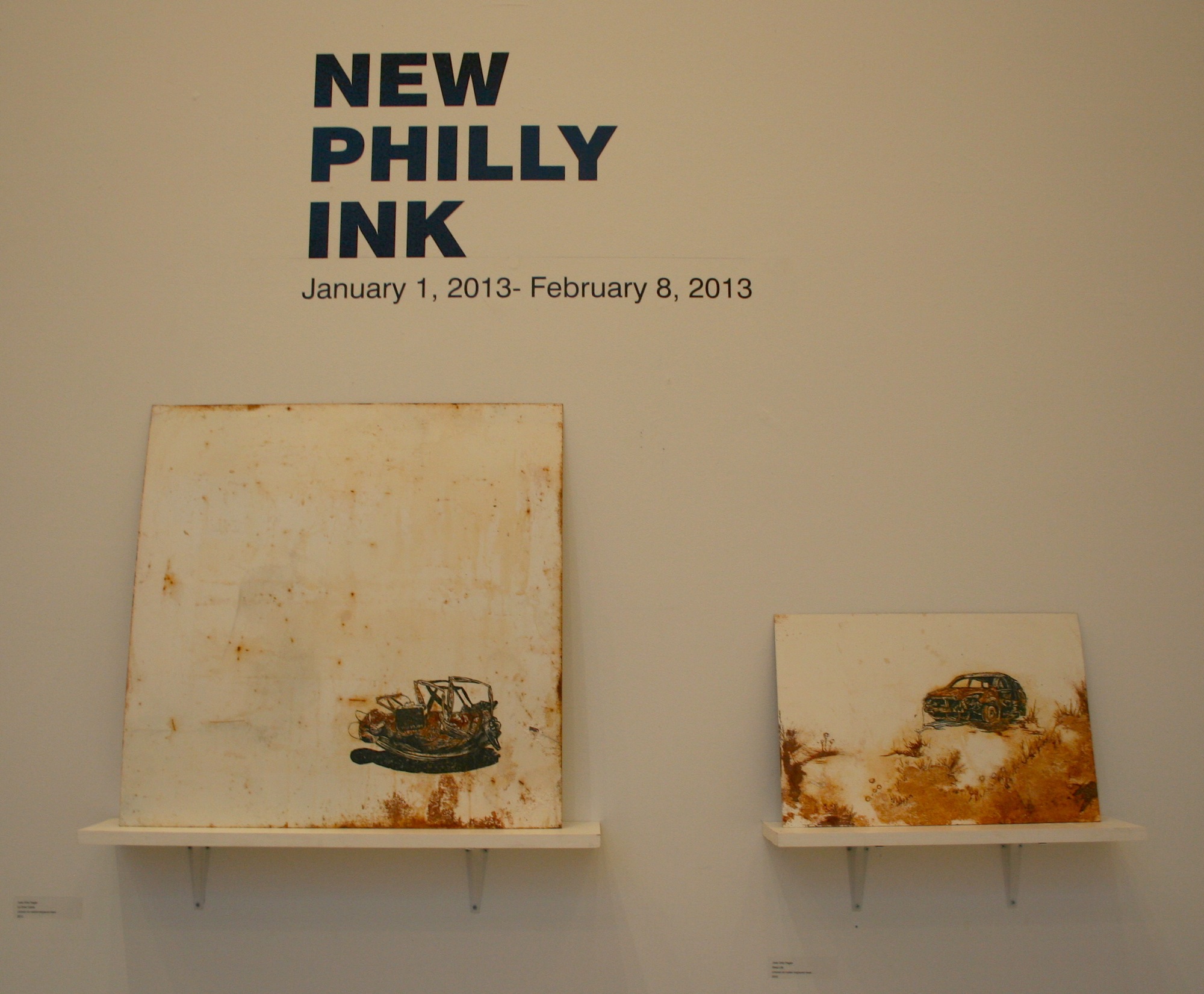 If New Philly Ink is any indication of what lies ahead for the Philadelphia art community, then we are all in for a treat. José Ortiz-Pagán’s work is rugged in the most exquisite way. Using a technique of linocut on rusted engraved steel, his pieces bear a delicate grittiness and complicate the represented automobile and insect forms with thoughts of decomposition and decay. Colin Foley’s use of intaglio & drypoint creates designs of chaotic minimalism that are beautifully framed by their own canvases.