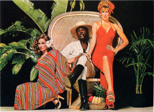 Another set of works re-presents printed advertisements. Thomas’ Are you the Right Kind of Woman for it? 1974/2007, depicts a black male seated on a rattan chair dressed in a safari-esque ensemble and flanked by two white women in bright red gowns. Palm trees and a basket full of tropical fruits compose the rest of the image. Speaking to the group, Thomas asked, “What do you think this advertisement was originally for?” Answers included cigars and Hawaii vacations, before someone correctly responded women’s fashion.
