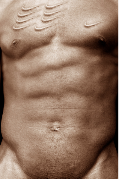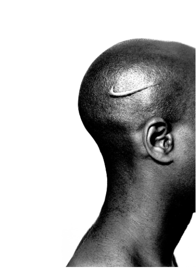 The first images in the space are from the Branded Series (2001-11) – perhaps the strongest in the show. Close-up photographs of the black male body echo Michael Jordan posters and Sports Illustrated spreads, highlighting definition, sleekness, and bone structure. (They should so clearly be erotic, but are anything but). Arrogance is conceptually subdued by the fact that these bodies are carved with Nike symbols, that definitive swoosh over the heart or on a shaved head – the placement symbolically pointing to the black male’s passion and intelligence as derivative of athleticism. Reference to scarification and popular culture, the past and the present, is reached with such precise simplicity, creating strong, powerful, and challenging statements at the gallery’s entrance.