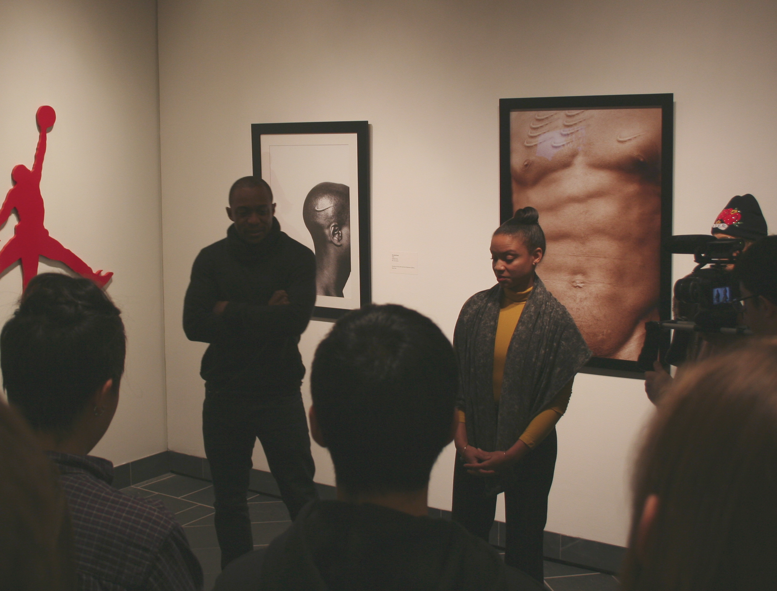 In the middle of the room, encircled by all of those bodies, eagerly engaging in a walk-through and public conversation about Other People’s Property, a survey of artist Hank Willis Thomas’ work, stood Thomas and curator Kalia Brooks, thinkers, collaborators and cousins. The conversation at this shows opening on Jan. 25 was a kinetic one, moving through the histories, concepts, and intentions – words trumping images, at least for that moment.