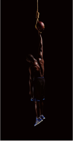 Thomas has an arresting ability to connect images and iconography of slave history with popular portrayals of black sports figures and their endorsements. Timberland and Jordan logos are merged into plantation landscapes and lynching narratives in a spookily easy manner in Thomas’ polished aluminum sculpture, Jordan and Johnny Walker in Timberland Circa 1923, 2009 and in the hauntingly poignant photograph Strange Fruit, 2011.