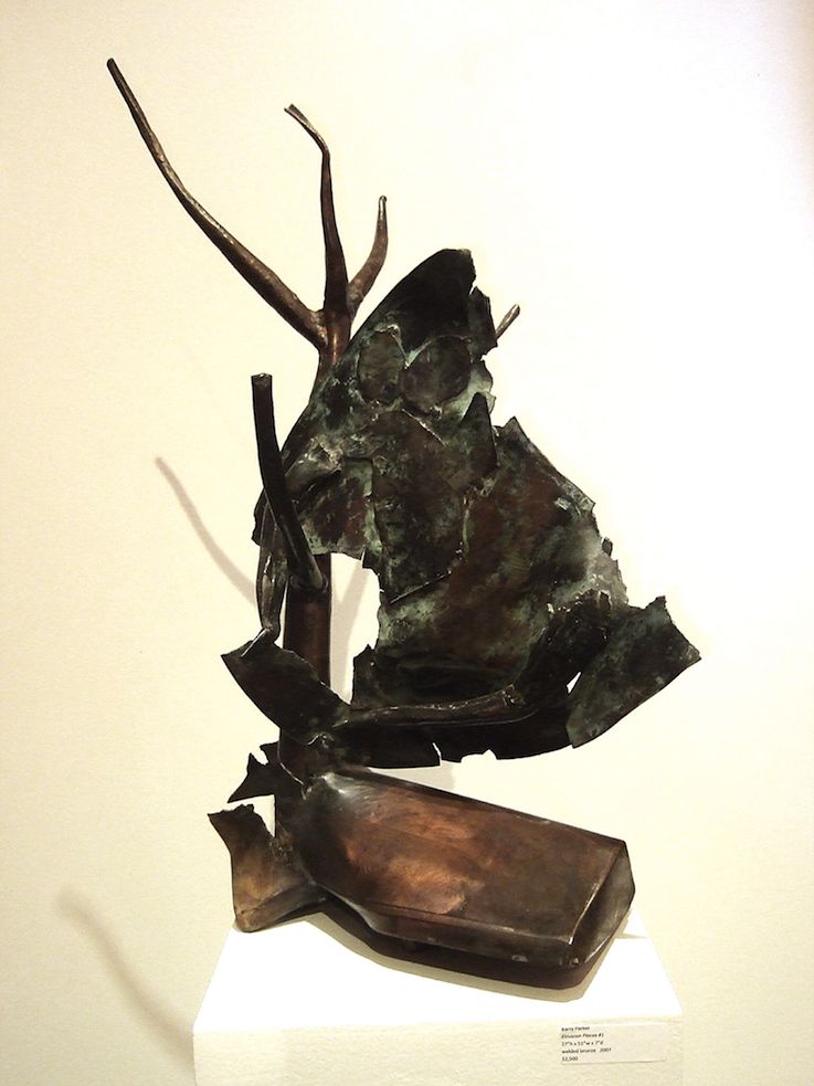 “Etruscan Places” by Barry Parker (above) is a welded bronze with a tree-like form breaking through a form like a tomb lid, with a greenish disc form on top of it.
