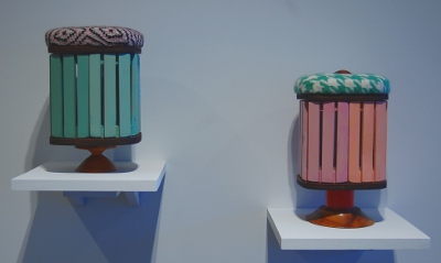 Other objects are less connected to the weaving and cloth ideas in the rest of the show or at least turn these themes on their head. A pair of wooden bird cages – one pink and one mint colored – have upholstered tops which seem more like pin cushions than the sculpture entitled “Pin Cushion” whose wooden form more resembles a butter-churner with a skirt; there appears to be no easy way to insert a pin into its form at all.