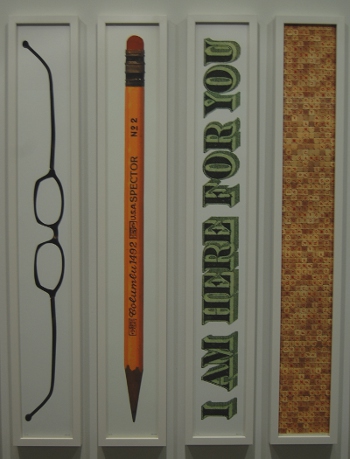 The third component of “But Not As Much As Tomorrow” is in the gallery’s vault space, a tiny room surrounded by 28 tall, vertical pigment prints entitled “Five And A Half By Forty” (the dimensions of the images). They depict all manner of household items, personal effects, and phrases which are surely meaningful to the artist in some way. These include a comb, a watch, a bobby pin, some National Geographic magazine spines, and many others. This collection of seemingly unrelated things helps to round out what culminates as a deeply personal and emotional show. Although it is object-based, Spector’s exhibit is far from materialistic. Nothing here even vaguely implies material desire and in many ways even touches on its antithesis. A frame with dollar-bill-text reading “I am here for you” asserts either the artist’s caring nature for the viewer or her peace of mind in accepting others’ good will. While the imagery of money generally calls to mind price, greed, or privilege, this manifestation extends only a helping hand.