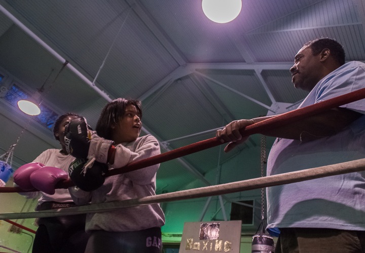 The Rec Center is the first grouping in the exhibit and an especially important part of the show and neighborhood. The Brewerytown Recreational Center offers everything from after school homework help to boxing lessons and is nationally recognized for producing several boxing professionals. An especially eye-catching image of two girls, Tyeara and Skylar, talking with Supervisor Fred Jenkins on a break from their training stands out within this first collection of images. This particular image, shot in color, balances the black and white images of the boys training at the Rec Center and mirrors the balance of the exhibition as a whole.