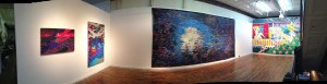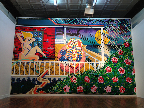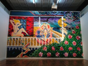 The largest painting in the show is “Sammy’s Girl,” a mammoth work that covers a wall along the back of the gallery. The images are rendered in a graphic way that seems to reference the 80’s. Friedman’s vivid color choices really bring his works to life. A buxom lady reclines on the right side of the porch and grabs your attention. She seems to be seated, but there is no chair visible.