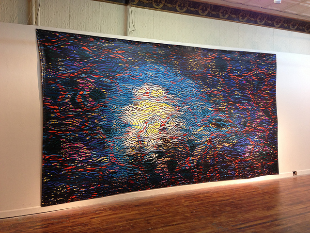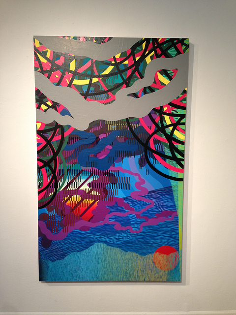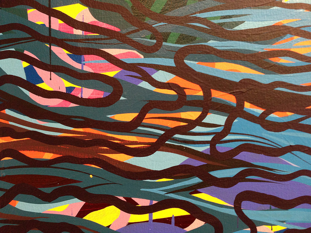 Friedman uses the paint liberally, building layer over layer to create scenes with great depth. Wiggly lines in “Oh, No!” create a pattern that is hypnotic and reminiscent of the optical illusion “hidden picture” books I used to fascinate myself with when I was young. The painting reminds me of a reflection of moonlight on water and has a soothing feel. The title of this painting adds some mystery though. I am not seeing the reason for the exclamation, but I am very curious about it. It may be a playful reference to Edvard Munch’s “The Scream,” which would be fitting because the painting, in its eerie reflections on the water, seems to visually echo that work.