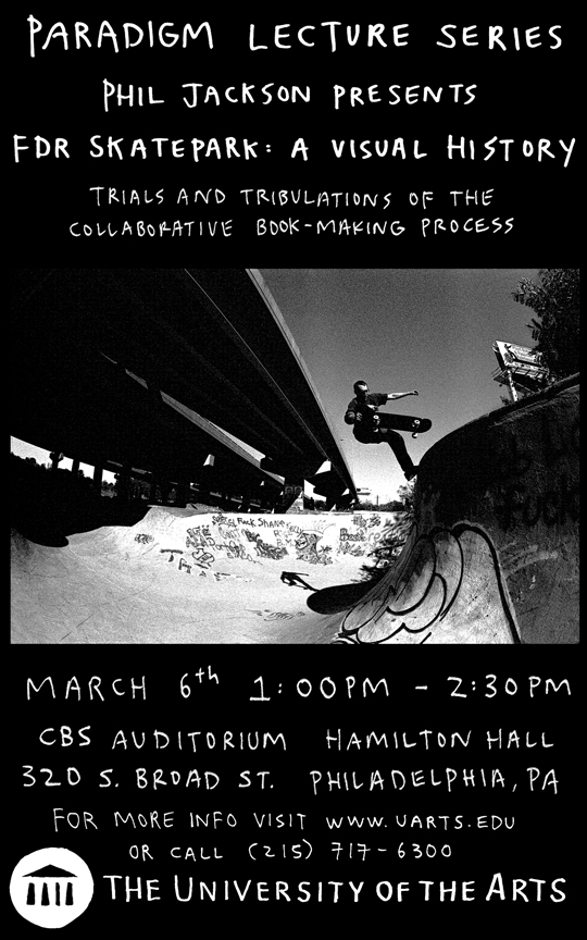 Phil Jackson, historian of all things skateboarding-related, is giving a free lecture titled FDR Skatepark: A Visual History at CBS Auditorium (320 South Broad Street) on Wednesday, March 6 at 1 P.M.