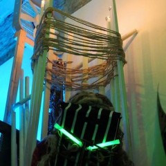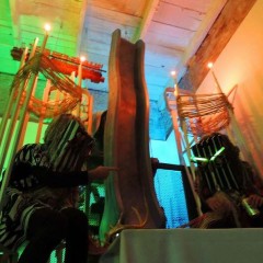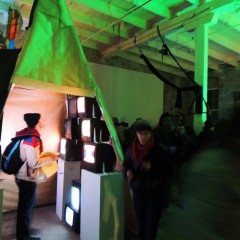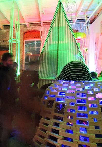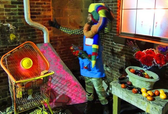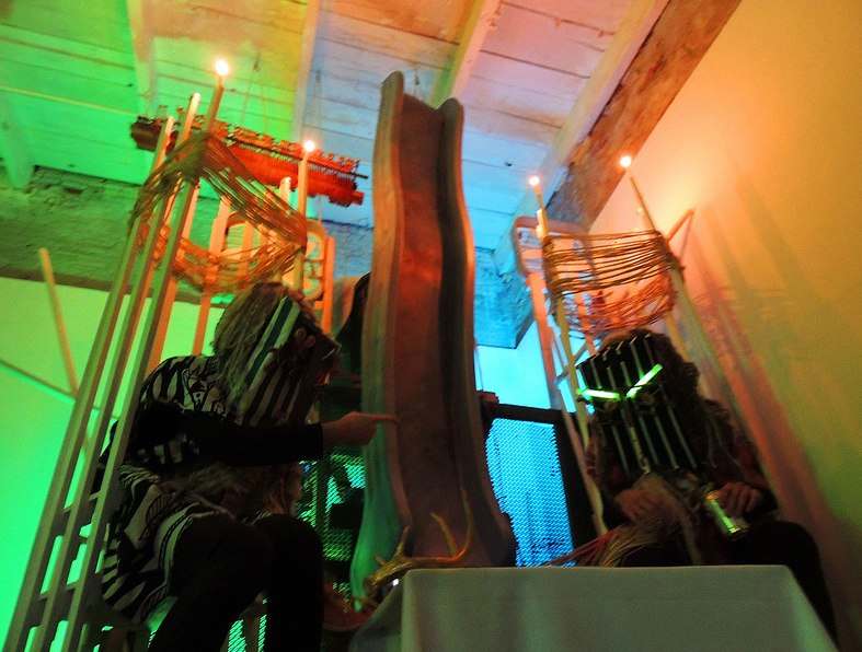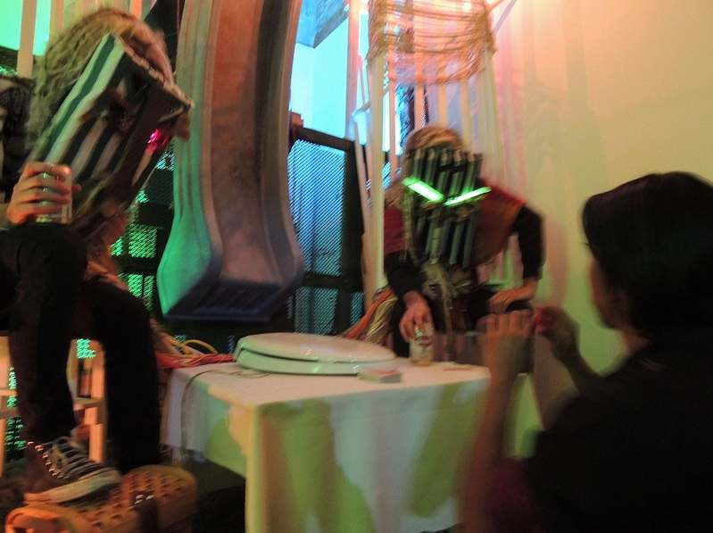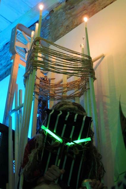 The opening night party, a reception unlike any other, gave an idea of what’s to come throughout March. A number of shared experiences, interactive performances scheduled through the night, involved the crowd in the creation of the “new world.” Elaborate structural art pieces stationed throughout the intimate gallery space were explored, inhabited and manipulated by party-goers and the happy-go-lucky Lords of the New World—monsters and human characters created and played by artists and actors connected to the gallery.