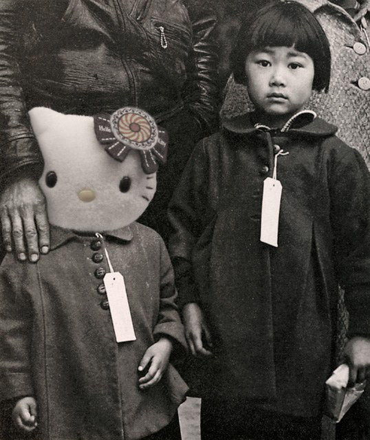 Appropriated photographs by Dorthea Lange also show up in the work of Scott Tsuchitani. His digital print of two young children, one with a Hello Kitty head, uses Lange’s photograph of the Mochida family which became part of the propaganda of the Second World War. Included in the Assimilation section, this print weaves past events with more current assimilations of culture. The Hello Kitty reference may suggest another version of an imprisoning stereotype with which Japanese Americans contend. With humor, the artist makes uncanny associations that expose the absurdity of stereotypes.