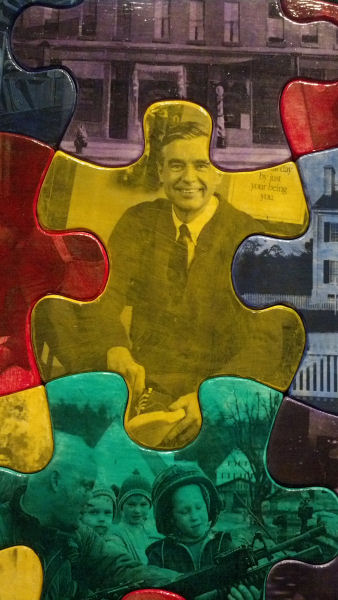 Many works of art in this exhibition successfully invite this dialogue, and Sungho Choi’s Model for My America is a summation of this idea. This large, mixed media work is a map of the US made with puzzle pieces, each printed with imagery varying from Guess jeans advertisements to Mr. Rogers to Act Up protests. For the puzzle pieces, Choi chose imagery that is, for the most part, recognizable. His America is made with uniquely American scenes and histories. In what would be the southwest is a Dorthea Lange photograph of a grocery store in San Francisco with a sign on the façade that reads: I am an American. The photo evinces the scrutiny endured by Japanese Americans after Pearl Harbor. Other famous images appear such as Timothy O’Sullivan’s portrait of five generations of an enslaved African American family in Beauford, South Carolina.