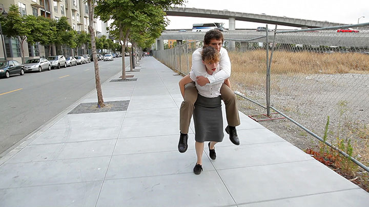 The video To Move A Body (Piggyback) consists of a woman in business attire carrying a similarly dressed man piggyback down a city sidewalk. The man, performed by Noah, holds his arms around the woman’s shoulders, and looks around blankly as the pair makes its way down the street. As the four minute and six second video progresses, the physical strain of Noah’s mass takes its toll on the woman. She has to readjust the positioning of her load, stumbles a few times, and ultimately collapses backwards from the weight. Though the action we witness on screen is simple and direct, the video is fascinating. Krell manages to confound the audience, balancing familiarity and absurdity in a way that renders us incapable of formulating an assumption about what might happen next.